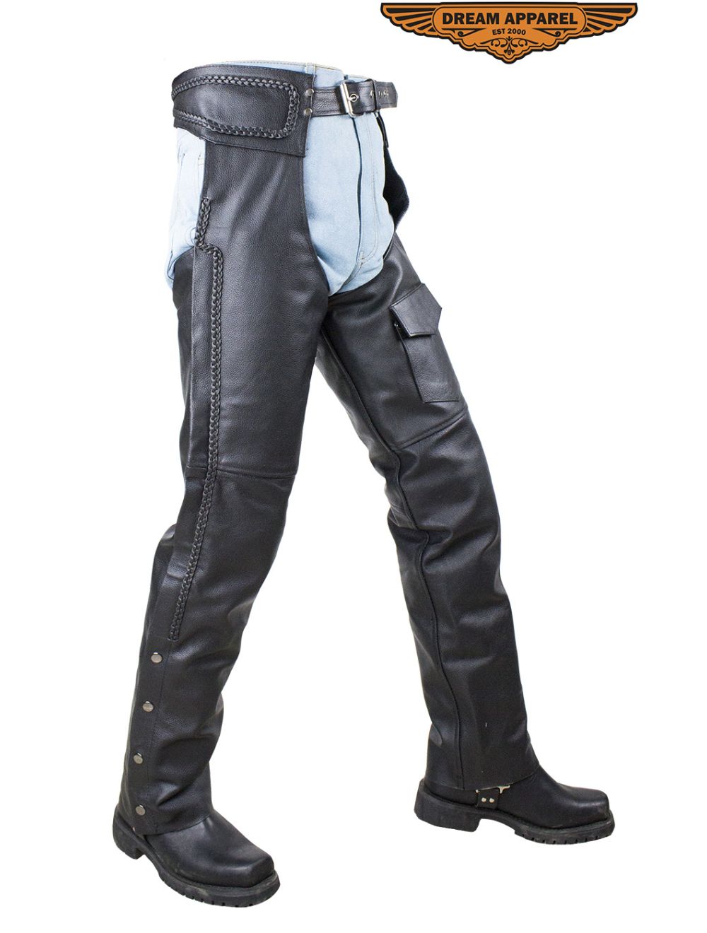 Our gorgeous black braided split leather chaps are here and these are top notch! They feature a very comfortable mesh and zipout lining and the entire look is made to standout. The leather is heavy duty top grade but also with a soft touch. There is a zipper that runs long the side of the pants until it reaches the snaps at the bottom that has a flap that hides the zipper. The chaps help you ride comfortably by providing the biker with grip while protecting from sweat and stirrup leather. If you're looking to improve on style while having alot of comfort doing so, then these are a no brainer.