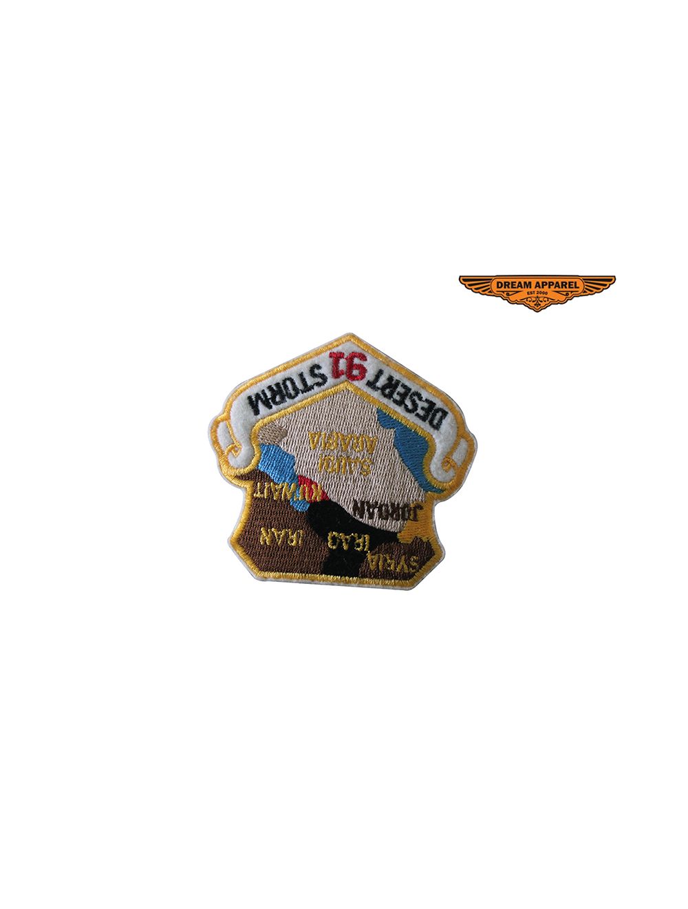 If you served in the military during the liberation of Kuwait, then you should be wearing our colorful Desert Storm patch and let others know wherever you ride. Measuring 2.75" x 3.00", it features a multicolored map of the Middle East with the names of the countries in gold embroidery, DESERT STORM in black and 91 in red on a white banner, and finished with a beautiful gold border. You should be proud of your service and this patch is sure to stand out wonderfully on any style vest or jacket. Our military patches are very popular so order yours today.