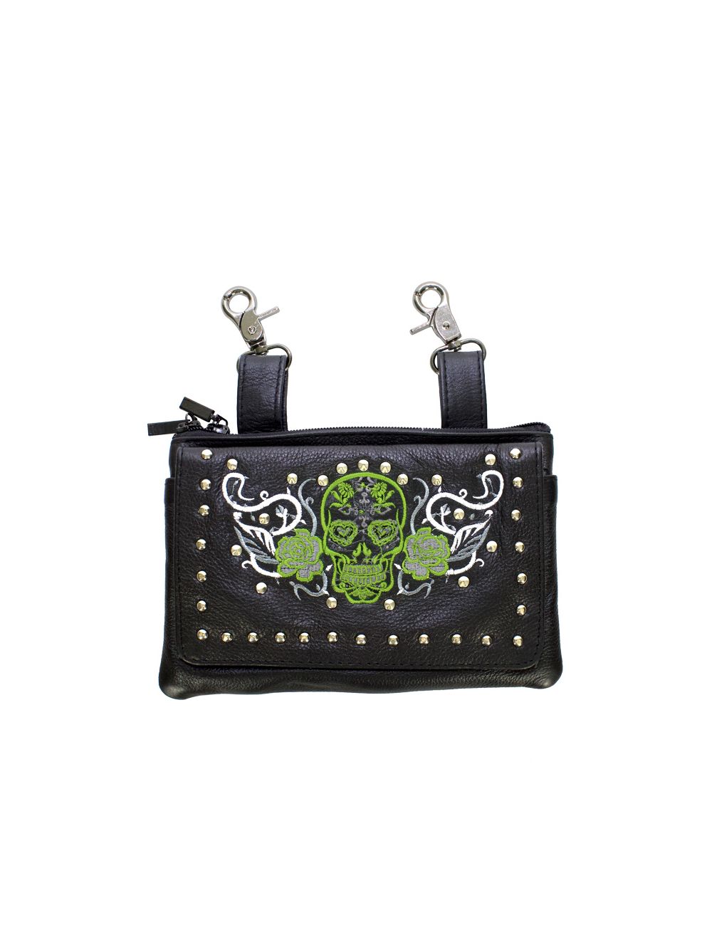 Dream Apparel's studded 8.5" x 5.5" fully naked cowhide leather belt bag with a lime green and white Sugar skull with white roses and chrome studs on the front flap pocket is perfect for quick runs to the store or long runs to that favorite rendezvous. Two magnets open to reveal a roomy textile lined compartment large enough for an iPhone 8 while the two zippered compartments let you carry loads more. You can attach it easily to your belt loops with two large chrome lobster clasps or wear it over your shoulder with the adjustable strap that comes included. Order yours today.