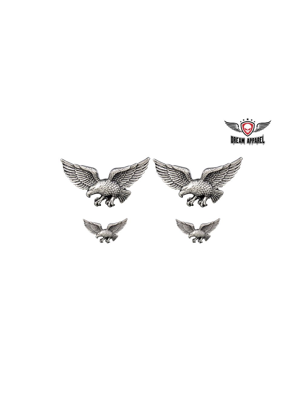 American Eagle Biker Pins made by Dream Apparel comes in a 4 pack, 2 Large pins and 2 small pins. The large pin’s height is 1” and the width is 2”. The small biker pin’s height is about .5” and the width is 1”. The larger American Eagle biker pins with pin lock can secure and customize your saddle bags, tool bags, sissy bar bag or any gear bags. You can also use our American Eagle biker pins as an accessory on your jackets, vests or shirts.