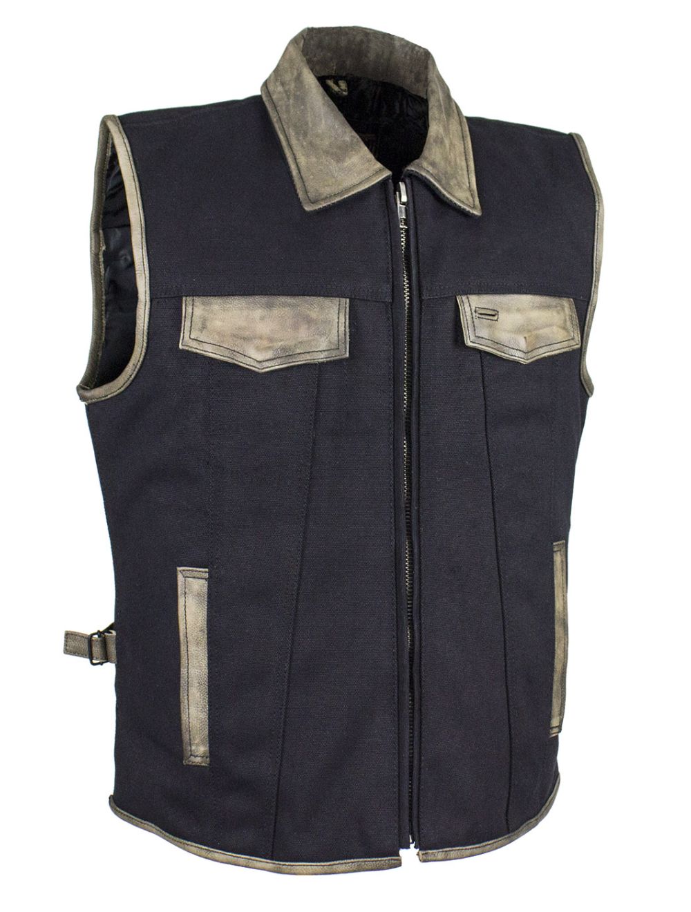 This Motorcycle Club Vest features two large gun pockets with elastic straps and genuine distressed brown leather trim. Made from durable black canvas, additional features include one large interior pocket with a zippered closure on the left, a large interior slip pocket on right, two button-snap flap pockets with the left flap having a slot to hold your sunglasses glasses, and two roomy slip pockets on the waist. For your comfort, we've included adjustable distressed brown leather side straps with loop buckles on the waist, a distressed brown leather fold-down collar with button snaps, distressed brown leather trim on the arms and waist, a zippered front closure, and a soft, smooth black liner to keep you feeling good for the ride. Better get your order in as these incredible vests sell quickly.