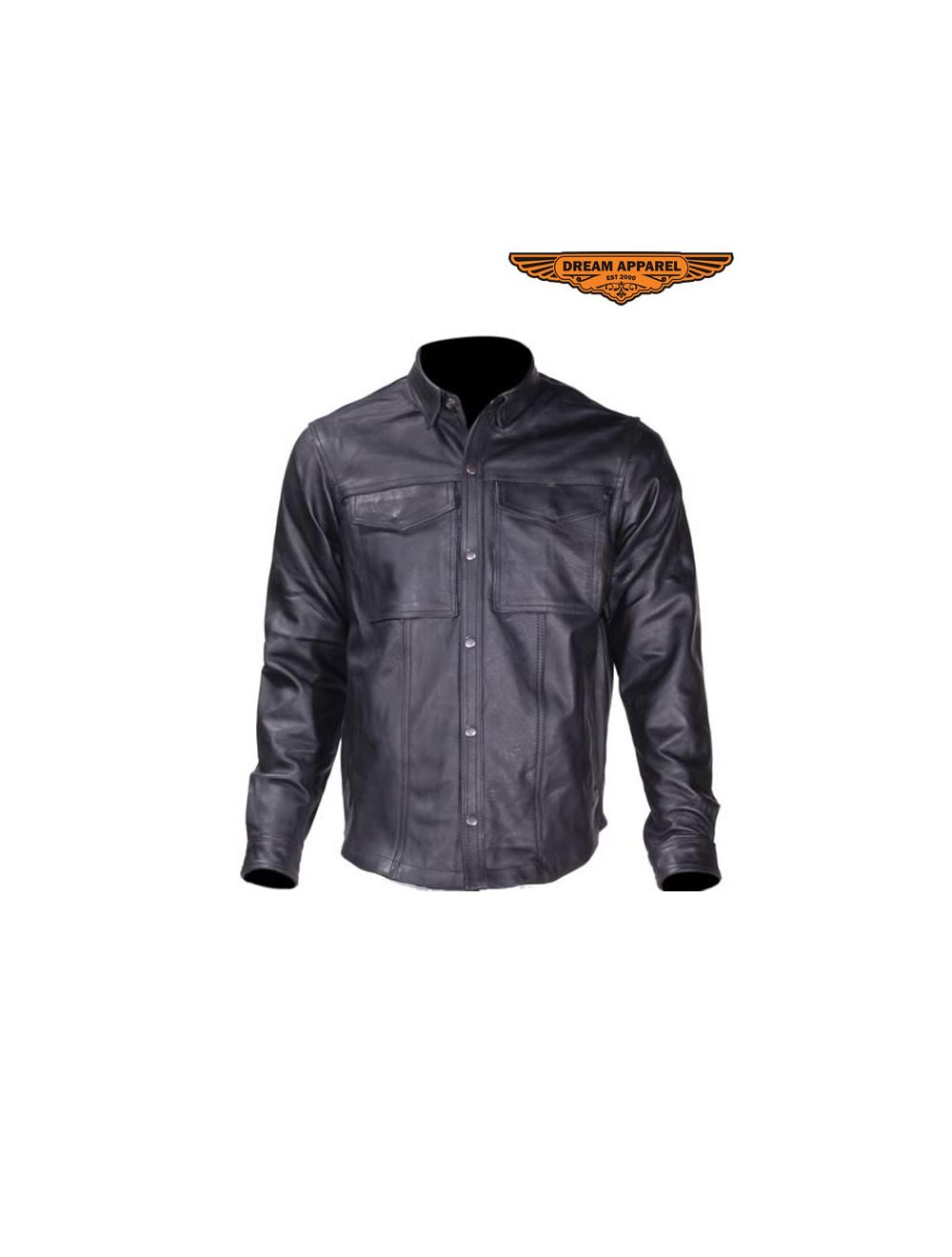 Dream Apparel's leather buttoned shirt is a great piece of gear for riding or going out. Our shirt is made from soft goat skin leather with stylish pleating and features a classic collar with button snaps, front button-snap closures, and button-snap cuffs. With two interior concealed gun pockets with straps, two front breast pockets with button snaps, and two roomy slip pockets on the waist you'll be ready for whatever the road brings. Lined for your comfort and warmth by a smooth polyester lining that provides an excellent fit and feel. Order yours before your next cruise, while supplies last.