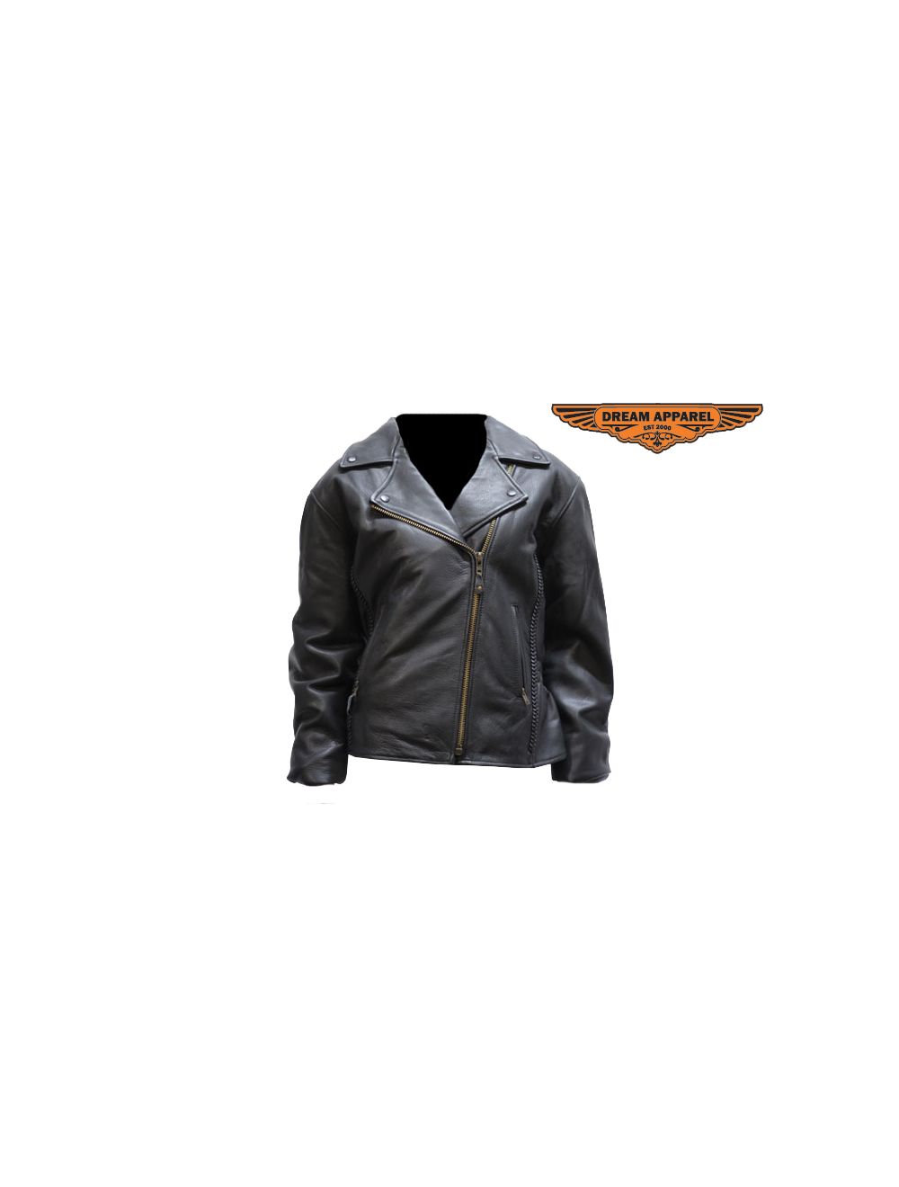 The leather jacket features tough durable zippers on zippered cuffs. It is gathered at the waist, multi pockets inside and outside, and it is braided on front and back. The Z/o lining runs through the sleeves. Snap down collar is perfect for windy rides.