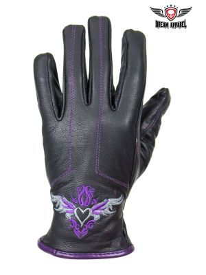 Purple-Heart Graphic Embroidered Leather Gloves SKU # GLZ106-EBL1-PURP