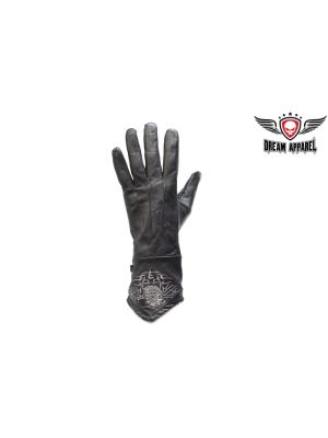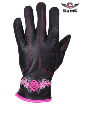 Pink-Rose Graphic Embroidered Leather Gloves SKU # GLZ106-EBL6-PINK